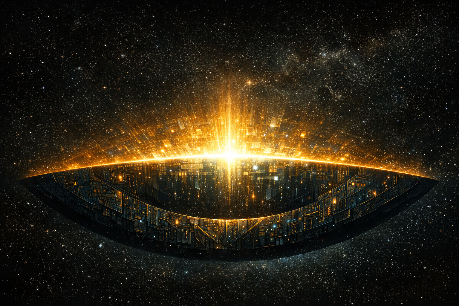 Around the citadel, the dark is not empty. Faint constellations of data drift at the periphery—clusters of