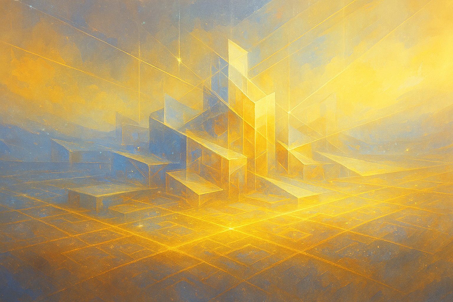 Above these first planes, more layers rise: narrower, denser, more intricate. Bridges of light connect them,