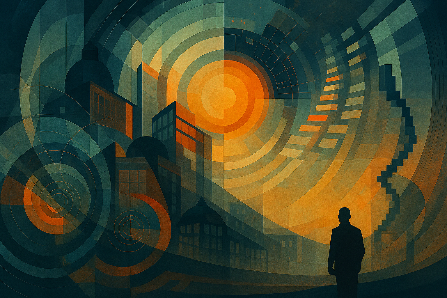 architecture and reasoning become the same thing, suspended in the dark like a mind made visible.